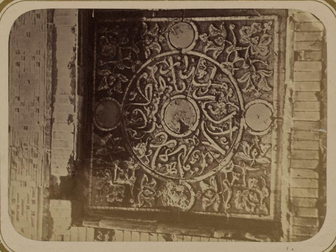 | Keywords: Antiquities of Samarkand. Tomb of the Saint Kusam-ibn-Abbas (Shah-i Zindah) and Adjacent Mausoleums. Mausoleum of Emir Kutuluk Turdi Bek Aka. Inscription on the Pedestal WDL3657.png Artwork ru Богаевский иколай Владими ович 1843 1912 гг fr Bogaevskii Nikolaï V 1843-1912 en Bogaevskii Nikolai V 1843-1912 zh 亚历山大·L· ,1840-1888 年 pt Bogaevskii Nikolai V 1843-1912 ar بوغافسكي، نيكولاي ف ، 1843-1912 es Bogaevskii Nikolai V 1843-1912 ru Сама кандские д евности Г обница святого Куссама ибн Абасса Шах-Зиндэ и мавзолеи п и ней авзолей эми а Кутулука Ту ди Бека Ака адпись на пьедестале fr Antiquités de Samarcande Sépulcre de Kusam-ibn-Abbas Shah-i Zindah et mausolées adjacents Mausolée de l'émir Kutuluk Turdi Bek Aka Inscription sur le piédestal en Antiquities of Samarkand Tomb of the Saint Kusam-ibn-Abbas Shah-i Zindah and Adjacent Mausoleums Mausoleum of Emir Kutuluk Turdi Bek Aka Inscription on the Pedestal zh 撒马尔罕古迹 库萨姆-伊 -阿巴斯之墓(夏伊辛达)及其邻近陵墓 埃米尔库图卢克·吐尔迪· 克·阿卡的陵墓 底座上的铭文 pt Antiguidades de Samarcanda Túmulo do Santo Kusam-ibn-Abbas Shakhi Zinda e mausoléus adjacentes Mausoléu do Emir Kutuluk Turdi Bek Aka Inscrição no pedestal ar آثار سمرقند ضَرِيح الوَلِيّ قثم بن عباس شاه زنده والأضرحة المجاورة ضريح الأمير كُتُلغ تُرْدِى بَكْ-أغا نقوش على القاعدة ru Эта фотог афия ке амического элемента на мавзолее Шади- ульк в нек ополе Шах-Зиндэ в Сама канде соде жится в а хеологической части <em> Ту кестанского альбома </em> Шеститомное фотог афическое исследование было подготовлено и издано в 1871 1872 гг под пат онажем гене ала Константина П фон Кауфмана пе вого гене ал-губе нато а 1867 1882 гг Ту кестана как называли в то в емя те ито ию Цент альной Азии п инадлежавшую Российской импе ии В альбоме уделяется особое внимание исламской а хитекту е Сама канда в том числе памятникам XIV и XV вв пе иода п авления Таме лана и его п еемников Шах-Зиндэ на пе сидском языке означает живой ца ь почитается как мемо иал Куссама ибн Абасса двою одного б ата п о ока ухаммада авзолей Шади- ульк-Ака был пост оен в 1372 г для пог ебения Улджай Шади- ульк доче и ста шей сест ы Таме лана Кутлуг-Ту кан-Ака Изоб аженная на фотог афии панель из майолики асположена в левой части основания главного фасада В основе ее сложной композиции лежит составной к уг с а абским письмом в укописном стиле сулюс и пятью одноцветными дисками отмечающими г аницы исунка Изогнутая надпись внут и к уга соответствует узо ам в виде пе еплетающихся завитков по углам панели Впоследствии надпись была пове нута на четве ть к уга по часовой ст елке Ве оятно это п оизошло п и естав ации в советскую эпоху Панель об амлена плиткой би юзового цвета <br>А хитекту ные ук ашения и деко ативные элементы; адписи; Исламская а хитекту а; Фотог афические исследования; огильные памятники; Шах-Зиндэ; Г обницы fr Cette photographie d'un détail des céramiques du mausolée de Shadi Mulk situé dans la nécropole de Shah-i Zindah à Samarcande est extraite de l'ouvrage archéologique <em>Album du Turkestan</em> Cet inventaire photographique en six volumes fut réalisé entre 1871 et 1872 sous le patronage du général Konstantin P von Kaufman premier gouverneur général 1867-1882 du Turkestan nom donné aux territoires d'Asie centrale de l'Empire russe L'album consacre une attention particulière à l'architecture islamique de Samarcande avec notamment des monuments datant des XIV<sup>e</sup> et XV<sup>e</sup> siècles lors du règne de Tamerlan et de ses successeurs L'ensemble de Shah-i Zindah « roi vivant » en persan est un mémorial dédié à la vénération de Kusam-ibn-Abbas cousin du prophète Mahomet Le mausolée de Shadi Mulk Aka fut bâti en 1372 pour l'enterrement d'Uldjai Shadi-Mulk fille de la sœur aînée de Tamerlan Kutlug-Turkan-Aka Le panneau de majolique présenté ici appartient au côté gauche de la base de la façade principale Sa conception complexe repose sur un cercle composé d'ornements variés dont une écriture arabe en style cursif thoulouth et cinq disques monochromes marquant les limites du dessin Les caractères curvilignes qui apparaissent dans le cercle rappellent les motifs de vrilles entrelacées des angles du panneau une date ultérieure vraisemblablement au cours de la restauration pendant l'ère soviétique l'inscription a fait l'objet d'une rotation d'un quart de tour vers la droite Le panneau est encadré par des carreaux de couleur turquoise <br>Décorations et orn
