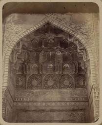 | Keywords: Antiquities of Samarkand. Tomb of the Saint Kusam-ibn-Abbas (Shah-i Zindah) and Adjacent Mausoleums. Mausoleum of Emir Kutuluk Turdi Bek Aka. Detail of the Upper Section on the Entry Arch WDL3659.png Artwork ru Богаевский иколай Владими ович 1843 1912 гг fr Bogaevskii Nikolaï V 1843-1912 en Bogaevskii Nikolai V 1843-1912 zh 亚历山大·L· ,1840-1888 年 pt Bogaevskii Nikolai V 1843-1912 ar بوغافسكي، نيكولاي ف ، 1843-1912 es Bogaevskii Nikolai V 1843-1912 ru Сама кандские д евности Г обница святого Куссама ибн Абасса Шах-Зиндэ и мавзолеи п и ней авзолей эми а Кутулука Ту ди Бека Ака Деталь ве хней части входной а ки fr Antiquités de Samarcande Sépulcre de Kusam-ibn-Abbas Shah-i Zindah et mausolées adjacents Mausolée de l'émir Kutuluk Turdi Bek Aka Détail de la section supérieure de l'arceau d'entrée en Antiquities of Samarkand Tomb of the Saint Kusam-ibn-Abbas Shah-i Zindah and Adjacent Mausoleums Mausoleum of Emir Kutuluk Turdi Bek Aka Detail of the Upper Section on the Entry Arch zh 撒马尔罕古迹 库萨姆-伊 -阿巴斯之墓(夏伊辛达)及其邻近陵墓 埃米尔库图卢克·吐尔迪· 克·阿卡的陵墓 入口拱门上半部分特写 pt Antiguidades de Samarcanda Túmulo do Santo Kusam-ibn-Abbas Shakhi Zinda e mausoléus adjacentes Mausoléu do Emir Kutuluk Turdi Bek Aka Detalhe da parte superior do arco de entrada ar آثار سمرقند ضَرِيح الوَلِيّ قثم بن عباس شاه زنده والأضرحة المجاورة ضريح الأمير كُتُلغ تُرْدِى بَكْ-أغا تفاصيل الجزء العلوي لقوس الدخول ru Эта фотог афия входной а ки мавзолея Шади- ульк в нек ополе Шах-Зиндэ в Сама канде соде жится в а хеологической части <em> Ту кестанского альбома </em> Шеститомное фотог афическое исследование было подготовлено и издано в 1871 1872 гг под пат онажем гене ала Константина П фон Кауфмана пе вого гене ал-губе нато а 1867 1882 гг Ту кестана как называли в то в емя те ито ию Цент альной Азии п инадлежавшую Российской импе ии В альбоме уделяется особое внимание исламской а хитекту е Сама канда в том числе памятникам XIV и XV вв пе иода п авления Таме лана и его п еемников Шах-Зиндэ на пе сидском языке означает живой ца ь почитается как мемо иал Куссама ибн Абасса двою одного б ата п о ока ухаммада авзолей Шади- ульк-Ака был пост оен в 1372 г для пог ебения Улджай Шади- ульк доче и ста шей сест ы Таме лана Кутлуг-Ту кан-Ака а фотог афии виден ве х а ки об амляющей нишу с по талом А ка и ниша пок ыты ке амикой в том числе плиткой майоликой и озетками фаянсовой мозаикой и а абским письмом в укописном стиле сулюс Ве хняя часть ниши пок ыта ук ашениями в виде сотовой ст укту ы <em>mocárabe</em> иша об амлена езными глазу ованными те акотовыми колоннами Основными цветами являются темно-голубой и би юзовый Тень в ве хней части изоб ажения указывает на то что фотог афия была сделана сквозь по тал мавзолея нап отив Ши ин-Бек-Ака <br>А хитекту ные ук ашения и деко ативные элементы; Исламская а хитекту а; Фотог афические исследования; огильные памятники; Шах-Зиндэ; Г обницы fr Cette photographie de l'arceau d'entrée du mausolée de Shadi Mulk situé dans la nécropole de Shah-i Zindah à Samarcande est extraite de l'ouvrage archéologique <em>Album du Turkestan</em> Cet inventaire photographique en six volumes fut réalisé entre 1871 et 1872 sous le patronage du général Konstantin P von Kaufman premier gouverneur général 1867-1882 du Turkestan nom donné aux territoires d'Asie centrale de l'Empire russe L'album consacre une attention particulière à l'architecture islamique de Samarcande avec notamment des monuments datant des XIV<sup>e</sup> et XV<sup>e</sup> siècles lors du règne de Tamerlan et de ses successeurs L'ensemble de Shah-i Zindah « roi vivant » en persan est un mémorial dédié à la vénération de Kusam-ibn-Abbas cousin du prophète Mahomet Le mausolée de Shadi Mulk Aka fut bâti en 1372 pour l'enterrement d'Uldjai Shadi-Mulk fille de la sœur aînée de Tamerlan Kutlug-Turkan-Aka Cette vue présente la pointe de l'arceau qui encadre une niche contenant le portail L'arceau et la niche sont recouverts de céramiques notamment des rosettes et des carreaux de majolique des mosaïques de faïence ainsi qu'une écriture arabe en style cursif thoulouth et la voûte en « nid d'abeilles » <em>mocarabe</em> dans la partie supérieure de la niche La niche est encadrée de colonnes en terre cuite sculptée et vernissée Les couleurs de base utilisées sont le bleu foncé et le bleu turquoise L'ombre masquant la partie supérieure indique que la photographie fut prise à travers le portail du maus