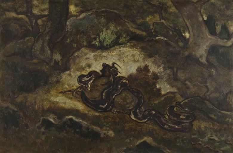 | Keywords: Antoine-Louis Barye - Python Crushing a Gnu - Walters 37815.jpg Barye has returned to a theme that he first explored in 1834-1839 when he modeled this subject as one of four animal combats that stood at the foot of the Tiger Hunt Walters 27 176 in the duke of Orléans's table centerpiece In this unusually large watercolor the setting is the Forest of Fontainebleau during daylight circa 1850 s-1860s watercolor with gum heightening on moderately textured moderately thick cream wove paper cm 32 7 49 8 accession number 37 815 11446 William T Walters Baltimore prior to 1889 mode of acquisition unknown Henry Walters city Baltimore Walters Art Museum Henry Walters Acquired by William T Walters before 1889 Watermark J Whatman Turkey Mill; Transcription Inscribed in graphite right of center on verso l Botanical Delights Floral Motifs in 19th-Century Art Strathmore Hall Art Center North Bethesda; Academy of the Arts Easton Easton; Government House Annapolis 1998-1999 A Discerning Eye Nineteenth-century Drawings and Watercolors Academy of the Arts Easton Easton 1998-1999 The Essence of Line Untamed The Art of Antoine-Louis Barye The Walters Art Museum Baltimore; Philbrook Museum of Art Tulsa; The Henry Morrison Flagler Museum Palm Beach 2007-2008 The Works of Antoine-Louis Barye American Art Gallery New York New York 1889-1890 Barye Sculpture and Drawings American Federation of Arts New York 1959-1960 A Connoisseur's Portfolio French Masterworks on Paper The Walters Art Gallery Baltimore 1992 The Wild Kingdom of Antoine-Louis Barye 1795-1875 Wildenstein Company New York 1994 place of origin Paris France Walters Art Museum license 2D A Connoisseur's Portfolio The Essence of Line Drawings and paintings by Antoine-Louis Barye French paintings in the Walters Art Museum |