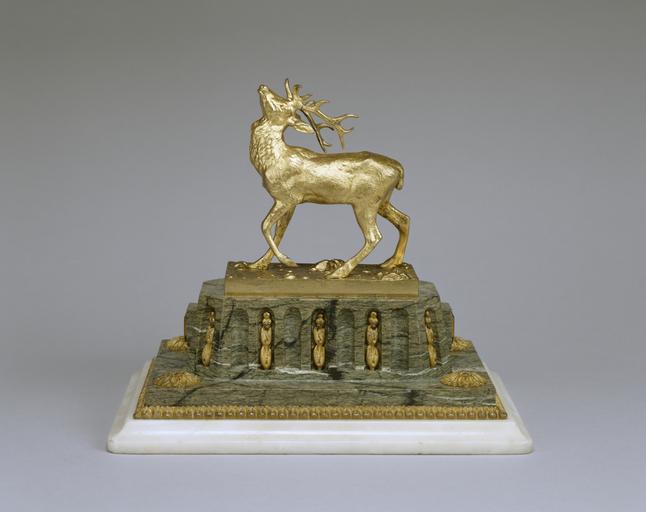 | Keywords: Antoine-Louis Barye - Stag with Head Raised Upwards; Stag Feeding - Walters 2775 - Profile.jpg Barye modeled this statuette while employed by the goldsmith Jacques Henri Fauconnier 1779-1839 To conceal the fact that this piece and Walters 27 74 are of different metal alloys they have been gilded and mounted on similar though not identical late 18th-century-style marble bases modeled 1820s gilt brass on a green and white marble plinth with gilt bronze appliqués cm 17 5 22 9 14 3 accession number 27 75 30935 William T / Henry Walters Collection Baltimore date and mode of acquisition unknown Walters Art Museum Henry Walters Acquired by William T or Henry Walters Signature Cast through from model BARYE Untamed The Art of Antoine-Louis Barye place of origin Paris France Walters Art Museum license Sculptures by Antoine-Louis Barye Sculptures in the Walters Art Museum Statues of deer Metal statues of animals 1820s statues |