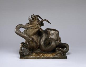 | Keywords: Antoine-Louis Barye - "Surtout de table" - Python Killing a Gnu - Walters 27152 - Profile.jpg Barye was fascinated by large snakes and portrayed them in sculptures and paintings Two Javanese pythons were sent to the Jardin des Plantes in 1838 In this sculpture a python has entwined itself around the body of a gnu an African antelope also known as a wildebeest This sculpture is one of four animal combats that originally stood at the base of the triumphal arch supporting the Tiger Hunt Two of the other combats Eagle Attacking a Wounded Ibex and Lion Attacking a Boar are now in the Louvre Museum; the fourth Tiger Devouring a Large Antelope belongs to the Detroit Institute of Arts between 1834 1839 bronze with warm brown patina over areas of metallic flake or powdered surface with traces of gilding cm 21 6 29 2 24 1 accession number 27 152 34005 Duc d'Orléans 1834 by commission duchesse d'Orléans Sale Paris January 18-20 1853 no 2 Alphonse de Hautpoul Maurice Mallet Henry Walters Baltimore November 19 1906 by purchase George A Lucas as agent Walters Art Museum Henry Walters Acquired by Henry Walters 1906 Signature Cast through from model BARYE The Romantics to Rodin French Nineteenth Century Sculpture from North American Collections Los Angeles County Museum of Art Los Angeles; Minneapolis Institute of Arts Minneapolis; The Detroit Institute of Arts Detroit; Indianapolis Museum of Art Indianapolis 1980-1981 Un âge d'or des arts décoratifs 1814-1848 Galeries nationales du Grand Palais Paris 1991 Untamed The Art of Antoine-Louis Barye The Walters Art Museum Baltimore; Philbrook Museum of Art Tulsa; The Henry Morrison Flagler Museum Palm Beach 2007-2008 place of origin Paris France Walters Art Museum license Sculptures by Antoine-Louis Barye Media contributed by the Walters Art Museum needs category review Sculptures in the Walters Art Museum Gnus in art Pythons in art |