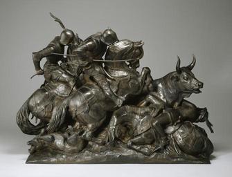 | Keywords: Antoine-Louis Barye - "Surtout de table" - Wild Bull Hunt - Walters 27178 - Profile.jpg Sixteenth-century Spanish hunters armed with spears and accompanied by dogs attack a wild bull It is a dangerous pursuit and one of the men has fallen backward over his collapsed horse The dogs are in peril as well Barye had access to the duke of Orléans's extensive library containing books devoted to history and travel It was from such sources that he might have derived inspiration for his subjects This unique lost-wax cast originally was placed next to the plinth carrying the central Tiger Hunt Walters 27 176 in the Duke d'Orleans' celebrated table centre-piece between 1834 1838 bronze lost-wax cast with brown varnish patina over yellow bronze with minute traces of gilding cm 47 6 35 6 accession number 27 178 1323 Duc d'OrlĂ©ans 1834 by commission duchesse d'OrlĂ©ans date of acquisition unknown by inheritance duchesse d'OrlĂ©ans Sale January 18-20 1853 no 3 or 4 Lutteroth date and mode of acquisition unknown Georges Petit date and mode of acquisition unknown William T Walters Baltimore April 29 1885 by purchase George A Lucas and Montaignac as agents Henry Walters city Baltimore Walters Art Museum Henry Walters Acquired by William T Walters 1885 Signature and Date Cast through from model BARYE / 1838; Transcription Inscribed on base BRONZE D'UN SEUL JET SANS CISELURE coule a l'hotel d'Angevilliers par honore Gonon / et ses deux fils 1838; Translation Inscribed on base Only bronze cast without carving cast at the Hotel D'Angevilliers by HonorĂ© Gonon and his two sons 1838 The Works of Antoine-Louis Barye American Art Gallery New York New York 1889-1890 Un âge d'or des arts dĂ©coratifs 1814-1848 Galeries nationales du Grand Palais Paris 1991 Highlights from the Collection The Walters Art Gallery Baltimore 1998-2001 Untamed The Art of Antoine-Louis Barye The Walters Art Museum Baltimore; Philbrook Museum of Art Tulsa; The Henry Morrison Flagler Museum Palm Beach 2007-2008 place of origin Paris France Walters Art Museum license Sculptures by Antoine-Louis Barye Media contributed by the Walters Art Museum needs category review Sculptures in the Walters Art Museum |