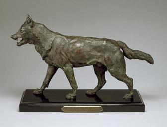 | Keywords: Antoine-Louis Barye - Walking Wolf - Walters 2765 - Profile.jpg A ferocious-looking striding wolf walks bares its teeth This unique cast is fastened to a black marble plinth bearing a plaque inscribed To his friend Rousseau / His admirer A L Barye Since the 1840s Barye had been a friend of Théodore Rousseau 1812-67 the landscape specialist who was regarded as the leader of the Barbizon school of painters modeled 1840s ; first cast ca 1874 bronze with dark brown patina with black and green undertones surface altered from corrosion cm 25 4 38 7 12 1 accession number 27 65 24149 Gaston Camentron former employee of Hector Brame William T Walters July 28 1888 by purchase George A Lucas as agent Henry Walters city Baltimore Walters Art Museum Henry Walters Acquired by William T Walters 1888 à l'ami ROUSSEAU / son admirateur A L Barye fr The Works of Antoine-Louis Barye American Art Gallery Untamed The Art of Antoine-Louis Barye place of origin Paris France Walters Art Museum license Sculptures by Antoine-Louis Barye Statues of wolves Untamed The Art of Antoine-Louis Barye The Works of Antoine-Louis Barye American Art Gallery Sculptures in the Walters Art Museum Male wolves |