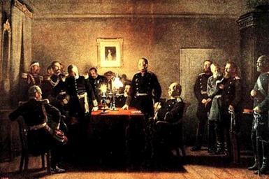 | Keywords: Anton von Werner, Kapitulations-Verhandlungen von Sedan (19. Jhdt.).jpg Artwork Creator Anton von Werner Kapitulations-Verhandlungen von Sedan Die deutsch-französischen Kapitulationsverhandlungen am 2 September 1870 Deutscher Verhandlungsführer ist Otto Graf von Bismarck 1815 “1898 A depiction of the talks in the village of w Donchery Ardennes department Ardennes France on 1870 09 02 hours after the French Army of Châlons had run up a white flag over Sedan Ardennes Sedan Members of the French delegation pictured on the left Supreme Commander Emmanuel Félix de Wimpffen just standing up General Auguste-Alexandre Ducrot and other officers Members of the delegation from the Prussian Coalition pictured on the right Supreme Commander Helmuth von Moltke the Elder standing at the table Otto von Bismarck sitting to Moltke's left Field Marshall Germany General Field Marshall Leonhard Graf von Blumenthal General Field Marshall Alexander August Wilhelm von Pape commanders of the 3rd- and the Maas-Army and other officers after 1870-09-02 oil canvas accession number object history credit line Uploaded by House1630 Ralf Prokop on 2009 10 16 other versions 100x100px Anton von Werner Kapitulations-Verhandlungen von Sedan 19 Jhdt Schwarz-Weiß-Version png PD-old-auto 1915 Paintings by Anton von Werner Auguste-Alexandre Ducrot Napoléon III surrenders 1870 Helmuth von Moltke the Elder Light in art Shadows in art |