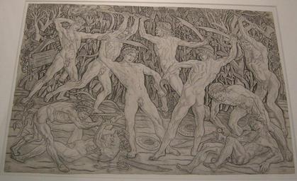 | Keywords: Antonio del pollaiolo, battaglia di ignudi.JPG Artwork Creator Antonio del Pollaiuolo ca 1467 1470 engraving size mm 428 618 Institution Victoria and Albert Museum Medieval and Renaissance 64 case 21 http //collections vam ac uk/item/O129251/battle-of-the-nudes-2nd-print-pollaiuolo-antonio/ Victoria and Albert Museum<br> WGA link 18046 http //www wga hu/art/p/pollaiol/antonio/painting/tennudes jpg http //www wga hu/html/p/pollaiol/antonio/painting/tennudes html object history ProvenanceEvent bequest Constantine Alexander Ionides credit line The work of the Florentine Antonio Pollaiuolo accession number CAI 793 place of creation Florence own sailko <gallery>File BLW Battle of the Nudes 2nd State jpg</gallery> graphics study Italian 1451-1500 PD-old-100 GFDL Cc-by-sa-3 0 I Sailko DEFAULTSORT Pollaiolo Antonio del; Battle of the Naked; Victoria and Albert Museum Battle of the Naked by Antonio del Pollaiolo Victoria and Albert Museum Prints in the Victoria and Albert Museum Photographs by User Sailko |