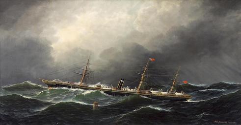 | Keywords: Antonio Jacobsen - The City of Berlin Steamship on High Seas, New York.jpg oil canvas in 32 60 object history credit line signed inscribed and dated 'Antonio Jacobsen 257 8 NY NY 1879' lower right accession number http //www bonhams com/auctions/16083/lot/1049/ Bonhams PD-old-auto-1923 1921 Antonio Jacobsen City of Berlin ship 1874 Paintings of ships 1879 paintings Images from Bonhams | ||||