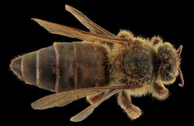 | Keywords: bug bugs bee bees pollinator pollinators animal animals animalia arthropod arthropods arthropoda insect insects insecta hymenoptera aculeata anthophila apoidea apidae apinae apini apis honeybee honeybees biml queen usgs droege apis mellifera apismellifera taxonomy:binomial=apis mellifera taxonomy:binomial=apismellifera maryland honey hive usgsbiml black background organic pattern pattern outdoor photo border monochrome Queen Bee photo spread. Collected by Tim McMahon from a colony in Talbot County, while slightly gummy as Honeybees are want to be, this series shows the longer abdomen, the odd curly dark hairs on top of the head and the broad hind tibia, but lacking the hairs and pollen basket that the workers have. Queen Bee photo spread. Collected by Tim McMahon from a colony in Talbot County, while slightly gummy as Honeybees are want to be, this series shows the longer abdomen, the odd curly dark hairs on top of the head and the broad hind tibia, but lacking the hairs and pollen basket that the workers have. |