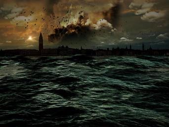 Keywords: apocalypse venice sea water promenade mystical atmospheric clouds birds forward steeple awesome dark