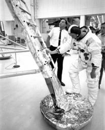 | Keywords: neil armstrong neilarmstrong apollo 11 apollo11 blackandwhite monochrome black and white "KSC, FL -- With a foot on one of the four landing pads, Apollo 11 CDR Neil A. Armstrong descends ladder of LM training spacecraft. While he and Edwin E. Aldrin, Jr., explore the Moon's surface, Michael Collins will pilot the CSM in lunar orbit. NASA directs the Apollo program." -- caption for NASA photo No. KSC-69P-578 (aka 69-H-1086), release date July 10, 1969. "KSC, FL -- With a foot on one of the four landing pads, Apollo 11 CDR Neil A. Armstrong descends ladder of LM training spacecraft. While he and Edwin E. Aldrin, Jr., explore the Moon's surface, Michael Collins will pilot the CSM in lunar orbit. NASA directs the Apollo program." -- caption for NASA photo No. KSC-69P-578 (aka 69-H-1086), release date July 10, 1969. |