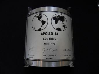 | Keywords: APOLLO 13 LUNAR PLAQUE replica.jpg en Each of the Apollo Lunar Modules LM slated to land on the moon bore a curved plaque around one of its legs This is a replica of the plaque intended for the Apollo 13 LM Aquarius It was to replace the plaque already bolted to the LM which had the name of astronaut T K Mattingly He was replaced by Jack Swigert days before the mission launched Since the lunar landing was cancelled the plaque was never updated own Vybr8 2010-04-06 File A13-plaque jpg Apollo 13 |