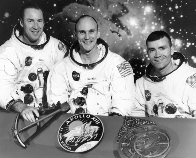 | Keywords: apollo 13 apollo13 blackandwhite groupshot people monochrome indoor black and white "Houston, TX -- The prime crew of the Apollo 13 lunar landing mission. From left: CAPT James A. Lovell, Jr., Apollo 13 CDR; LCDR Thomas K. Mattingly, II, USN, Apollo 13 CMP; and Fred W. Haise, Jr. They are seated behind the mission emblem, and two items of importance to early navigation, the octant (l.) and the Hindu (?) astrolabe (r.). A view of the Lagoon Nebula is in the background." -- caption for U.S. Navy photo 1143249, dated December, 1969. Photo by NASA, printed at Naval Photographic Center Naval Station in Washington, D.C. "Houston, TX -- The prime crew of the Apollo 13 lunar landing mission. From left: CAPT James A. Lovell, Jr., Apollo 13 CDR; LCDR Thomas K. Mattingly, II, USN, Apollo 13 CMP; and Fred W. Haise, Jr. They are seated behind the mission emblem, and two items of importance to early navigation, the octant (l.) and the Hindu (?) astrolabe (r.). A view of the Lagoon Nebula is in the background." -- caption for U.S. Navy photo 1143249, dated December, 1969. Photo by NASA, printed at Naval Photographic Center Naval Station in Washington, D.C. |