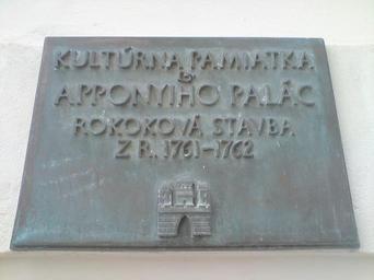 | Keywords: Aponiho palác table.jpg 101-189/0 Plaque on the Apponyis' palace Radničná Bratislava; The sign reads Cultural monument; Apponyi's palace; rococo building from years 1761-1762 Emléktábla az Apponyi-palota falán Pozsony; A felirat magyar fordítása Kulturális műemlék;Apponyi-palota;rokokó építmény az 1761-1762-es évekből Pamätná tabuľa na paláci Apponyiovcov Radničná Bratislava Tafel am Aponiho Palais Radnicá Bratislava Own 2008-04 Wizzard Own work all rights released Public domain Aponiho Palace in Bratislava Plaques in Bratislava Signs of cultural heritage monuments in Slovakia |