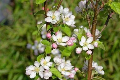 Keywords: apple blossom flowers white and pink blooms veins branches leaves apple tree spring close-up detail