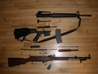 | Keywords: AR-15 and SKS field strip.JPG en AR-15 and SKS field stripped Both rifles can be taken apart in seconds with out tools except for the SKS gas cylinder which requires a sharp metal object to turn the handguard catch lose Own BigBattles 2009-05 SKS AR-15 Field strip SKS Bayonets |