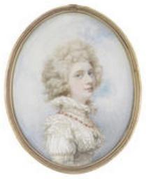 | Keywords: ArabellaWilliams WifeOf SirJohnHamlyn1stBaronet.png en Miniature portrait of Arabella Williams 1740-1797 wife of Sir James Hamlyn 1st Baronet 1735-1811 of Edwinsford Carmarthenshire Wales and Clovelly Court in Devon Member of Parliament for Carmarthen 1793-1802 and Sheriff of Devon 1767-8 School of Richard Cosway RA British 1742-1821 A full-length double portrait on paper by Cosway of the Hamlyns walking arm in arm and wearing Van Dyck costume exists in the Victoria Albert Museum E 11-2002 Gold frame with pierced suspension loop blue glass to the reverse Oval 85mm 3 3/8in high One of pair with matching portrait of her husband Pair sold for £1 375 inc premium at Bonhams Auctioneers Knightsbridge London auction 20767 Fine Portrait Miniatures 30 May 2013 lot 98http //www bonhams com/auctions/20767/lot/98/ http //www bonhams com/auctions/20767/lot/98/ School of Richard Cosway RA British 1742-1821 1780 Richard Cosway Portrait miniatures of women PD-old-100 Images from Bonhams |