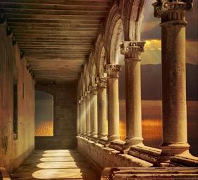 Keywords: arcade architecture building columnar historically arch gang arches light romantic idyll round arch stone masonry sea outlook sunset incidence of light sunbeam light and shadow hispanic lichtspiel fairy tales castle old antique
