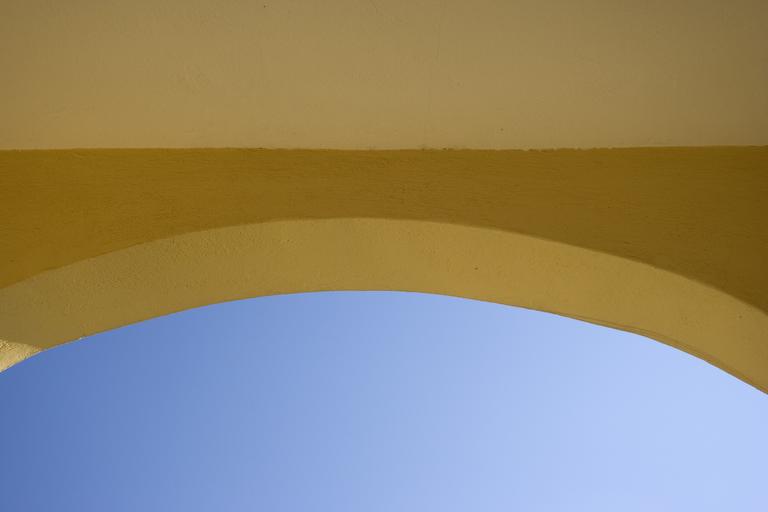 Keywords: arch yellow building wall sky blue entrance door exterior outdoor architectural top high structure