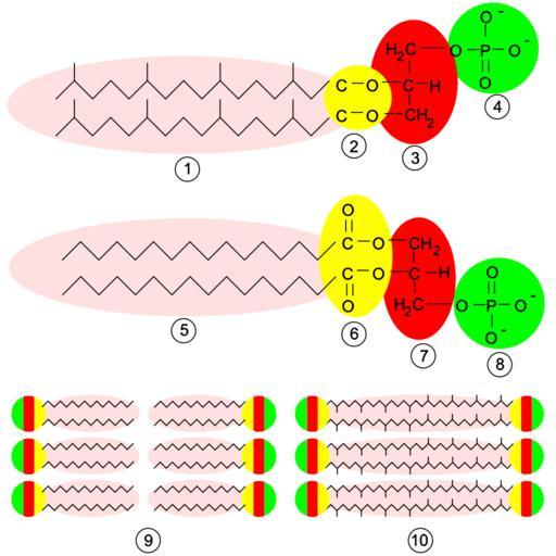 | Keywords: Archaea membrane.svg Archaeal membrane structure Adapted from http //www ucmp berkeley edu/archaea/archaeamm html Up archaeal membrane 1-isoprene sidechain 2-ether linkage 3-L-glycerol 4-phosphate moieties Medium bacterial and eukaryan membrane 5-fatty acid 6-ester linkage 7-D-glycerol 8-phosphate moieties Bottom 9-lipid bilayer in bacteria eukarya and most archaea 10-lipid monolayer in some archaea self-made using http //www xfig org xfig 2007-08-30 Franciscosp2 Archaea diagrams Ether lipids |