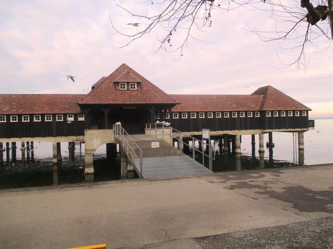 Keywords: architecture building bath house wood winter lonely historically landmark lake constance tree plane rorschach switzerland