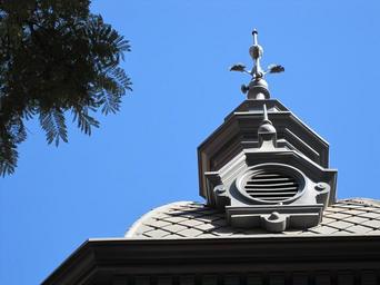 Keywords: architecture building church ornate historic decorative blue sky tree grey roof pattern spire