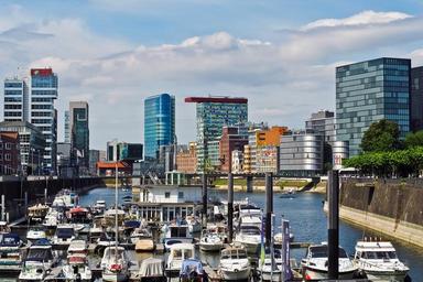 Keywords: architecture media harbour düsseldorf building port modern city rhine harbour area city view glass water clouds urban skyline ships boats yachts inland port office building