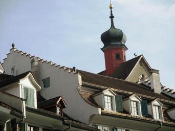 Keywords: architecture old town tower onion dome roofs roof landscape historically bischofszell thurgau switzerland