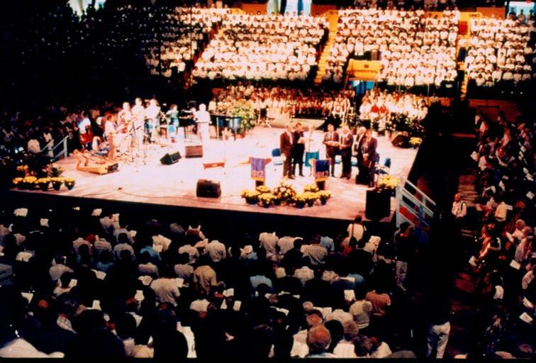 | Keywords: opening night openingnight stage arena convention centre conventioncentre mennonite world conference winnipeg manitoba canada mennoniteworldconferencewinnipegmanitobacanada people crowd Caption: Some 16,000 plus have taken their seats; the stage is set; the cast is ready; and the stage hands are standing by. And Jake said, 'Let the program begin!' And behold, it was good! Many committee members and volunteers had worked hard to prepare for this week, and had awaited the Opening Night with some anxiety. Would it all work? And then, when this large, multi-cultural family raised its voice in praise to its creator God, the anxiety melted away and prayers of thanks were quietly said that everything could have come together so beautifully. Citation: Mennonite World Conference. Twelfth Mennonite World Conference, 1990, Winnipeg, Canada. Slides by T. Klassen; Script by John Dyck. X-9 Box 52 Folder 4 Slide 16. Mennonite Church USA Archives - Goshen. Goshen, Indiana. Caption: Some 16,000 plus have taken their seats; the stage is set; the cast is ready; and the stage hands are standing by. And Jake said, 'Let the program begin!' And behold, it was good! Many committee members and volunteers had worked hard to prepare for this week, and had awaited the Opening Night with some anxiety. Would it all work? And then, when this large, multi-cultural family raised its voice in praise to its creator God, the anxiety melted away and prayers of thanks were quietly said that everything could have come together so beautifully. Citation: Mennonite World Conference. Twelfth Mennonite World Conference, 1990, Winnipeg, Canada. Slides by T. Klassen; Script by John Dyck. X-9 Box 52 Folder 4 Slide 16. Mennonite Church USA Archives - Goshen. Goshen, Indiana. |