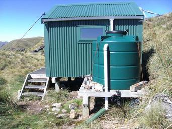Keywords: Arete hut 2.jpg Arete hut W Tararua Range Tararua ; water tank 2016-01-17 Own Sarang Arete Hut