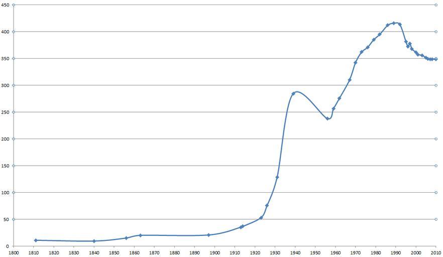 | Keywords: Arh.people.png Динамика численности населения А хангельска с 1811 по 2010 годы источник данных http //www mojgorod ru/arhangel_obl/arhangeljsk/index html энциклопедия « ой Го од» Ось X - год ось Y - население в тысячах человек Own 2011 Sasha Krotov Arkhangelsk Temporal population graphs of Russia |