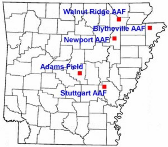 Keywords: Arkansas-aaf-map.jpg Locations of World War II Army Air Force bases in Arkansas self-made on PD basemap 2008-04-16 Bwmoll3 Maps of Arkansas