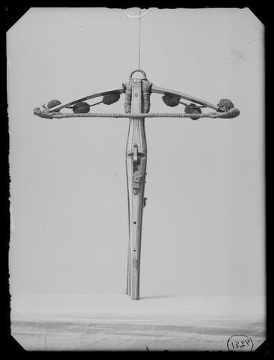 Keywords: Armborst, Tyskland, 1590-talet - Livrustkammaren - 53493.tif LSH artwork sv Båge av stål med på ena sidans baksida stämpel Stöckel II nr 6451 På bågens framsida flätat snöre med på vardera sidan tre ursprungligen blå bollar av ylle Bågen fästad vid stocken med snörning Tjock tvinnad sträng av hampa <br/>Lås med nöt och stränghållare av stål och snälltryck samt säkringsnyckel <br/>Stock av ben med smala inlagda band av valnöt och ebenholts på sidorna i inv 1867 angivet som elfenben mahogny och ebenholts Kolv med liten vinge Uppfällbart rektangulärt sikte av stål Rak baktill nedåtböjd varbygel lindad med ursprungligen gult och blått ullgarn med tofs På stockens ovansida pilhållare av mörkt horn samt framtill bygel av stål original caption decade 1590 string - steel - woolen Färg blå material ylle - hemp - walnut - ebony - wool yarn Färg gul blå material ullgarn - horn g 2040 size mm 589 525 LRK Alexander Ludvig Soldin Grosshandlare place of origin DE original filename LN_E00062 43465 inventory number LRK 6822 53493 CC0 Armborst Tyskland 1590-talet - Livrustkammaren - 53493-negative tif Media contributed by LSH 2015-11 Crossbow images from Livrustkammaren