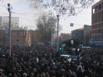 | Keywords: Armenian Presidential Elections 2008 Protest Day 11 - French Embassy Demonstration 330pm police car ablaze.jpg The 11th day of Armenian presidential election protests At 7 30 am the peaceful camp-in protest at Liberty Square in Yerevan was violently ended by Armenian special forces which used truncheons and electric shock devices to disperse the crowd of around 1 000 At 12 30 pm a new crowd marches to the French Embassy in a spontaneous demonstration At around 3 20 pm a white unmarked military jeep drove through the crowd at high speed east bound on Argishti St and southbound onto Grigor Lusavorich Ave running over 2 women In this picture 3 30pm the police car has been captured and set ablaze; the policeman escaped on foot Own 2008-03-01 Serouj 40 10 29 93 N 44 30 19 60 E Demonstrations and protests relating to the Armenian presidential elections 2008 |