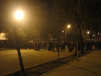 | Keywords: Armenian Presidential Elections 2008 Protest Day 11 - 1205AM Activist Frontlines.jpg The 11th day of Armenian presidential election protests At 7 30 am the peaceful camp-in protest at Liberty Square in Yerevan was violently ended by Armenian special forces which used truncheons and electric shock devices to disperse the crowd of around 1 000 At 12 30 pm a new crowd marches to the French Embassy in a spontaneous demonstration barricade themselves using abandoned police buses and grow in number to around 150 000 By 12 am about 2 000 demonstrators are left barricaded <br/><br/>This picture 12 am shows the activist front lines about 500ft southwest of the police front lines at Shahumyan Square Note the riot shields confiscated from police and the police bus barricade in the background right Activists hold long metal rods and have some Molotov cocktails ready No firearms or grenades were seen despite government reports Own 2008-03-02 Serouj 40 10 32 19 N 44 30 25 61 E Demonstrations and protests relating to the Armenian presidential elections 2008 |