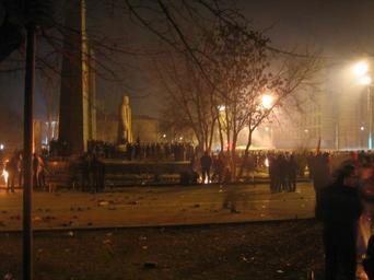 | Keywords: Armenian Presidential Elections 2008 Protest Day 11 - 1240AM Miasnikyan Square - rocks and statue2.jpg The 11th day of Armenian presidential election protests At 7 30 am the peaceful camp-in protest at Liberty Square in Yerevan was violently ended by Armenian special forces which used truncheons and electric shock devices to disperse the crowd of around 1 000 At 12 30 pm a new crowd marches to the French Embassy in a spontaneous demonstration barricade themselves using abandoned police buses and grow in number to around 150 000 By 12 am the bulk of the approximately 2 000 demonstrators left in the area are at Miasnikyan Square in front of the French Embassy while only tens of people are at the site of the looting of a grocery store near the intersection of Mashdots Ave and G Lusavorich Street a quarter mile northwest of the location of this camera The nearest police are stationed at Shahuman Square 1/3 of a kilometer northeast of the location of this camera Police allow looting to continue in the area of Mashdots Ave and G Lusavorich for several hours as government TV crews film tens of people looting the grocery store <br/><br/>In this picture 12 40 AM the heart of the demonstration at Miasnikyan Square The platform where organizers speak using loudspeakers is in front of statue Rocks in the foreground are placed for use in case of another police attack Own 2008-03-02 Serouj 40 10 29 99 N 44 30 20 42 E Demonstrations and protests relating to the Armenian presidential elections 2008 Statues in Yerevan |