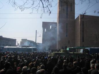 | Keywords: Armenian Presidential Elections 2008 Protest Day 11 - French Embassy Demonstration 2pm people demanding APC and buses to leave.jpg The 11th day of Armenian presidential election protests At 7 30 am the peaceful camp-in protest at Liberty Square in Yerevan was violently ended by Armenian special forces which used truncheons and electric shock devices to disperse the crowd of around 1 000 At 12 30 pm a new crowd marches to the French Embassy in a spontaneous demonstration In this picture 2pm the people demand that the APC and all military and police transporters leave the area Own 2008-03-01 Serouj 40 10 29 93 N 44 30 19 60 E Demonstrations and protests relating to the Armenian presidential elections 2008 |
