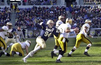 | Keywords: 001202-N-2383B-520 Navy Football Game.jpg en 001202-N-2383B-520 BALTIMORE Maryland December 2 2000 -- Brad Wimsatt 94 and the Navy defense apply serious pressure to Army quarterback Chad Jenkins 10 during the Naval Academy's 30-28 victory over the Army's Black Knights U S Navy photo by Photographer's Mate 1st Class Johnny Bivera RELEASED 2000-12-02 001202-N-2383B-520 Navy http //www navy mil/view_image asp id 392 U S Navy photo by Photographer's Mate 1st Class Johnny Bivera PD-USGov-Military-Navy Images from US Navy location BALTIMORE Md 2000 Army-Navy Game December 2000 photographs People of the United States in 2000 Males with American football helmets |
