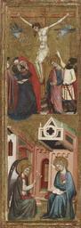 | Keywords: Arnau Bassa - Triptych with Madonna and Child with the Crucifixion and the Annunciation - Walters 37468 - A T Left.jpg Circle of The central scene of this altarpiece depicts the enthroned Madonna and Child flanked by angels The Christ Child holds a tiny European goldfinch a symbol of his resurrection The bird is tethered a reminder that in the 14th century such animals were kept as pets by children Angels present Mary with chalices of white flowers alluding to her purity On the left appear the Annunciation and the Crucifixion while Christ's Presentation in the Temple and the Coronation of the Virgin are on the right The delicate punch-work decoration and the slender graceful figures reveal the influence of Sienese painting Catalan artists learned the style and techniques of Italian painting by examining imported Italian works in local churches; some even traveled to Italy to perfect their craft ca 1340 1348 Medieval tempera and gold leaf on panel cm 126 8 184 9 accession number 37 468 1582 Henry Walters Baltimore 1931 mode of acquisition unknown Walters Art Museum Henry Walters Acquired by Henry Walters 1931 The International Style The Arts in Europe Around 1400 The Walters Art Gallery Baltimore 1962 place of origin Catalonia Spain Walters Art Museum license 2D Triptych with Madonna and Child with the Crucifixion and the Annunciation Media contributed by the Walters Art Museum needs category review |