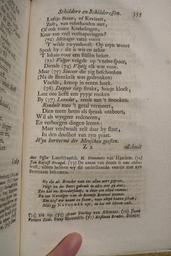 | Keywords: Arnold Houbraken VII p 355.JPG en Copy of Arnold Houbraken's Schouburg from 1719 published and sold by the author nl Lustje Steur of Kaviaart Zult van velerhanden aart Of ook zoute Krakelingen Keur van veel versnaperingen 72 Meleager vatte voort 'T wilde zwynshooft Op myn woort Sprak hy dit is wis en zeker 'T lokaas voor een frissen beker 73 Volger volgde op 't zelve spoor Diende 74 Vlytig elk wat voor Maar 75 Sinceer die zig beschonken Na de Bentkelk was gedronken Voelde kroop in eenen hoek 76 Dapper riep straks houje kloek Laat ons liefst een pypje rooken By 77 Leander reeds aan 't smooken Ronduit meê 't getal vermeert Dien meer brein als spraak ontbeert Wil als wysgeer redeneren En verborgen dingen leeren Maar verdwaalt zelf daar hy staat In den doolhof van zyn praat Wyn hervormt der Menschen geesten 72 Jan Baptist Breugel 73 De naam van deze is ons onbewust alleen hebben wy dit onderstaande vaersje met zyn Bentnaam bekomen Gy die als Broeder van ons allen word gegrtet Volgt na des Bents gebruik in alles wat gy doet; Zoo zal ons Broederschap u daar om altyd roemen En een Navolger van de Roomse Bentwet noemen Zoo blyf uw naam en faam voor altyd buiten schult Mits gy Navolger zyt en het ook blyven zult 74 zie 19 75 Arent Teerling van Alkmaar 76 Joano Vernero Tam fraai Bloemsch 77 Kristiaan Reuder Bataljeschild 2015-04-23 17 46 24 own PD-old-100 Jane023 other versions cc-0 Schouburg II Uploaded with UploadWizard Bentvueghels |