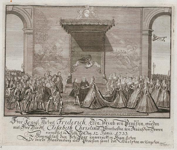 Keywords: Arolsen Klebeband 15 259.jpg Grafik aus dem Klebeband Nr 15 der Fürstlich Waldeckschen Hofbibliothek Arolsen Motiv Hochzeit Friedrichs des Großen mit Elisabeth Christine von Braunschweig-Bevern 1732 auf Schloss Salzdahlum http //digi ub uni-heidelberg de/fwhb/klebeband15 1732 F G Schmidt Creator Georg Friedrich Schmidt Public Domain due to age The scan is also licensed CC-BY-SA 3 0 DE PD-old-100 Arolsen Klebeband 15 1732 engravings Friedrich II of Prussia Elisabeth Christine of Brunswick-Bevern Castle of Salzdahlum Marriage in art Georg Friedrich Schmidt |