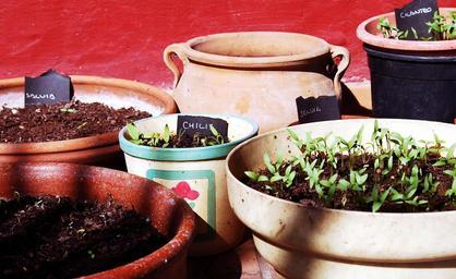 Keywords: aromatic plants cilantro chilis first outbreaks plant nature outbreaks of leaf green first leaves sprout sow planting pots planters flowerpot plants potted plant garden orchard aromatic crock sage
