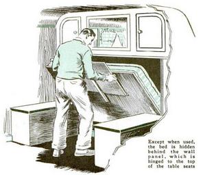 | Keywords: drawing sketch Popular Science July 1937 Bedding Arrangement. When the trailer is small and space is limited, it may be possible to work out a table and bed arrangement such as that used by John Wells and shown in the drawings above. The box spring or mattress is attached on the bottom to plywood, or whatever type of panel board was used on the inside of the trailer, and fastened to each breakfast-seat box with hinges so it can be let down to lie flat on the seat cushions. Bedding is fastened to the mattress with large safety pins. When the bed is swung into the storage Space, the table can be brought down into position. haw-creek.com/improved-trailer-fittings-make-life-on-whee... Popular Science July 1937 Bedding Arrangement. When the trailer is small and space is limited, it may be possible to work out a table and bed arrangement such as that used by John Wells and shown in the drawings above. The box spring or mattress is attached on the bottom to plywood, or whatever type of panel board was used on the inside of the trailer, and fastened to each breakfast-seat box with hinges so it can be let down to lie flat on the seat cushions. Bedding is fastened to the mattress with large safety pins. When the bed is swung into the storage Space, the table can be brought down into position. haw-creek.com/improved-trailer-fittings-make-life-on-whee... |