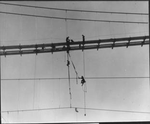 | Keywords: Arranging wind bracing for suspension bridge - NARA - 294023.jpg Scope and content Photograph from Volume Two of a series of photo albums documenting the construction of the Grand Coulee Dam and related work on the Columbia Basin Project General notes 294023 Local identifier Department of the Interior Bureau of Reclamation Engineering and Research Center 05/18/1981 - 03/04/1988 NARA's Rocky Mountain Region Denver NRGA Building 48 Denver Federal Center West 6th Avenue and Kipling Street Denver CO 80225-0307 1935-09 Record group Record Group 115 Records of the Bureau of Reclamation 1889 - 2008 Record group ARC 444 Photograph albums compiled 1903 - 1972 Series ARC 293611 File unit File unit ARC Variant control numbers NAIL Control Number NRG-115-CONSTPHO85006-COLBASIN2730 Other versions <gallery> File Arranging wind bracing for suspension bridge - NARA - 294023 tif tif </gallery> NARA-cooperation PD-USGov Construction of the Grand Coulee Dam Men at work in the United States Suspension bridges in Washington state |
