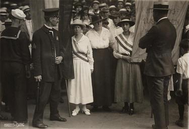 Keywords: Arrest of White House pickets 160038v.jpg Photograph of Catherine Flanagan Left and Mrs William Upton Madeleine Watson R of the National Woman's Party being arrested as they picket with banners before the White House East Gate Heckling sailor to left policemen left and right arresting policewoman center crowd of men behind Title derived by Library of Congress staff Photograph published in The Suffragist 5 no 83 Aug 25 1917 6-7 Similar photograph printed in The Suffragist 5 no 83 25 Aug 1917 6-7 Captioned Arrest of Miss Catherine Flanagan and Mrs William Upton Watson at East Gate of White House with Banner `How Long Must Women Wait for Liberty ' Sailors and Roughs Encouraged by Police Shown in Background Handwritten caption on the back of a similar photograph in NWP identifies the two women as Catherine Flanagan and Gertrude Crocker Catharine M Flanagan was arrested picketing August 1917 sentenced to 30 days in Occoquan Workhouse Mrs William Upton Watson of Chicago Illinois was treasurer of the Illinois state branch of the NWP She was arrested Aug 17 1917 for picketing and sentenced to 30 days in Occoquan Workhouse Arrested again in August 1918 she was sentenced to five days for participation in Lafayette Square meeting Gertrude Crocker served three jail sentences 30 days for picketing the White House in 1917; 10 days for assisting Lafayette Square meeting 1918 and five days for watchfire demonstration 1919 Source Doris Stevens Jailed for Freedom New York Boni and Liveright 1920 357 359 369 1 photograph print 5 25 x 7 in accession number Call Number Location National Woman's Party Records Group I Container I 160 Folder Pickets--Arrests and Imprisonment Source Collection Records of the National Woman's Party Repository Manuscript Division http //connecticuthistory org/women-of-the-prison-brigade/ http //hdl loc gov/loc mss/mnwp 160038 PD-Harris-Ewing Suffragettes White House in 1917 Demonstrations and protests in Washington D C