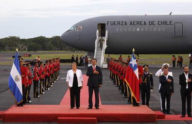 Keywords: outdoor Presidenta de Chile , Michelle Bachelet es recibida por el Canciller , Hugo Martínez. Presidenta de Chile , Michelle Bachelet es recibida por el Canciller , Hugo Martínez.