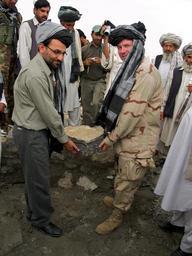| Keywords: Arsala Jamal lays a dam's cornerstone.jpg 070510-N-3385W-001 KOZA BOKHANA Afghanistan May 10 2007 - Cmdr Dave Adams and Gov Jamal place the cornerstone for a diversion dam in the village of Koza Bokhana Afghanistan This dam will provide water needs for more than 3 000 local residents This is the third dam started in the past two weeks under a new 1 5 million program for reconstruction in the province U S Navy photo RELEASED http //www navy mil/list_all asp id 30004 2007-05-10 Christopher Weis PD-USGov-Military-Navy 070510-N-3385W-001 Navy http //www navy mil/view_image asp id 46049 070508-N-3385W-003 Navy http //www navy mil/list_all asp id 30004 Khost Province in the War in Afghanistan 2001-present Provincial Reconstruction Teams in Afghanistan Dave Adams Irrigation in Afghanistan Arsala Jamal Cornerstone ceremonies |