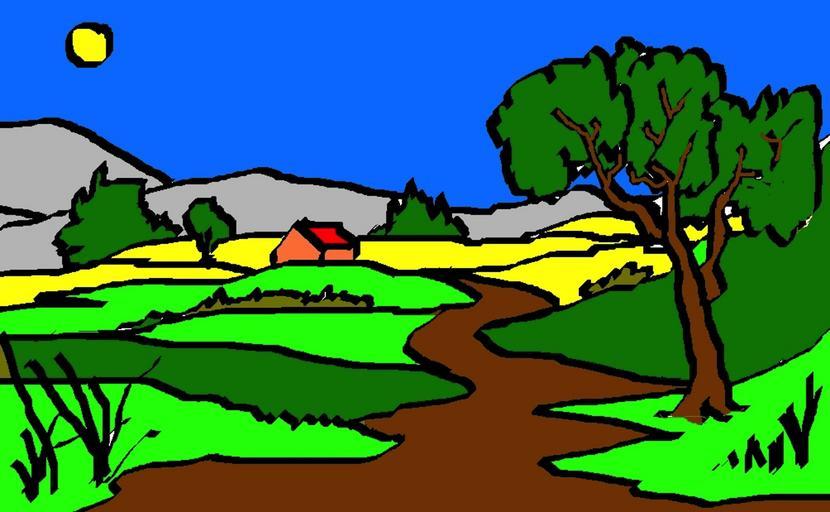 Keywords: art drawing landscape sky trees stream mountain grass artistic farm barn outside beautiful