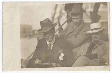 | Keywords: smithsonian institution smithsonianinstitution sepia 1940s paper pen hats three men threemen venice arthur covey arthurcovey italy journal writing postcard 1905 black and white photography blackandwhitephotography photo photograph vintage bla archives of american art archivesofamericanart monochrome black and white Description: Picture postcard showing Covey, East and Brangwyn in gondola in Venice. Identification on verso (handwritten): Sir Alfred East - L; Frank Brangwyn R; Arthur Covey Center back. Taken in a gondola in Venice in 1905. Covey, Arthur Sinclair, 1877-1960 Brangwyn, Frank, Sir, 1867-1956 Creator/Photographer: Unidentified photographer Medium: Black and white photographic print Dimensions: 9 cm x 14 cm Date: c. 1905 Persistent URL: www.aaa.si.edu/collections/images/detail/arthur-covey-ven... Repository: Archives of American Art Collection: Arthur Sinclair Covey papers, 1882-1960 Accession number: aaa_covearth_5014 Description: Picture postcard showing Covey, East and Brangwyn in gondola in Venice. Identification on verso (handwritten): Sir Alfred East - L; Frank Brangwyn R; Arthur Covey Center back. Taken in a gondola in Venice in 1905. Covey, Arthur Sinclair, 1877-1960 Brangwyn, Frank, Sir, 1867-1956 Creator/Photographer: Unidentified photographer Medium: Black and white photographic print Dimensions: 9 cm x 14 cm Date: c. 1905 Persistent URL: www.aaa.si.edu/collections/images/detail/arthur-covey-ven... Repository: Archives of American Art Collection: Arthur Sinclair Covey papers, 1882-1960 Accession number: aaa_covearth_5014 |