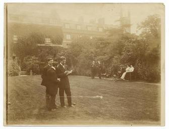 | Keywords: smithsonian institution smithsonianinstitution croquet sepia two men twomen outdoor archives of american art archivesofamericanart monochrome Description: Identification on verso (handwritten): From left to right - Frank Brangwyn, art dealer from Paris, Arthur Covey, Sir Alfred East, McCall, an unknown man, Mrs. Brangwyn, and Mrs. McCall. Covey, Arthur Sinclair, 1877-1960 Brangwyn, Frank, Sir, 1867-1956 Creator/Photographer: Unidentified photographer Medium: Black and white photographic print Dimensions: 17 cm x 22 cm Date: c. 1905 Persistent URL: www.aaa.si.edu/collections/images/detail/arthur-covey-and... Repository: Archives of American Art Collection: Arthur Sinclair Covey papers, 1882-1960 Accession number: aaa_covearth_5016 Description: Identification on verso (handwritten): From left to right - Frank Brangwyn, art dealer from Paris, Arthur Covey, Sir Alfred East, McCall, an unknown man, Mrs. Brangwyn, and Mrs. McCall. Covey, Arthur Sinclair, 1877-1960 Brangwyn, Frank, Sir, 1867-1956 Creator/Photographer: Unidentified photographer Medium: Black and white photographic print Dimensions: 17 cm x 22 cm Date: c. 1905 Persistent URL: www.aaa.si.edu/collections/images/detail/arthur-covey-and... Repository: Archives of American Art Collection: Arthur Sinclair Covey papers, 1882-1960 Accession number: aaa_covearth_5016 |