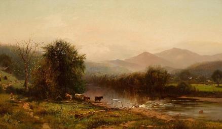 Keywords: arthur parton art artistic artistry painting oil on canvas sky clouds nature outside country countryside trees landscape scenic mountains valley cattle stream creek water reflections