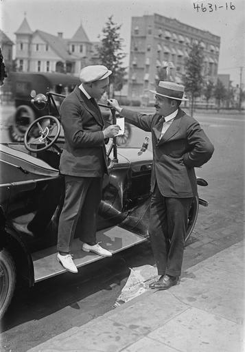 | Keywords: ArthurFieldsRunningboardAuthograph.jpg U S singer and Vaudeville star Arthur Fields at left stands on automobile running board talking to unidentified man with moustache and straw boater hat Bain News Service photo via Library of Congress website at http //hdl loc gov/loc pnp/ggbain 27163 Converted from TIFF to jpg and edges cropped before upload Not dated c 1920s Uncredited photographer for Bain News Service PD-Bain Arthur Fields Standing men 1920s fashion Flat caps Straw boaters unidentified automobiles People with automobiles |